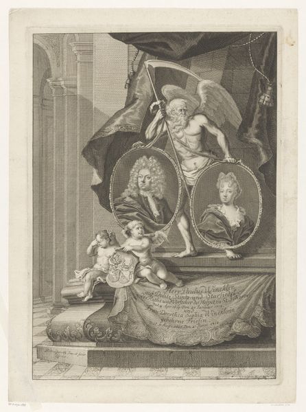 This allegorical portrait of Johann Joachim von Sandrart was made by Johann Jakob von Sandrart in the late 17th century. It's an etching, a printmaking process that relies on the corrosive action of acid to create lines in a metal plate. Look closely, and you'll see a network of fine, precise lines. These were incised into a prepared metal plate, likely copper, with a sharp tool. The plate would then have been submerged in acid, which bit away at the exposed lines. The longer it was submerged, the deeper and darker the lines would be. Ink is then applied to the plate and wiped away from the surface, remaining only in the etched lines. Finally, the plate is pressed onto paper, transferring the image. The skill involved in etching lies in controlling the acid's bite and manipulating the lines to create depth, texture, and tone. This print isn't just an image; it's a testament to the engraver's mastery of materials and processes. It reminds us that even in seemingly "flat" artworks, materiality and making play a crucial role.
