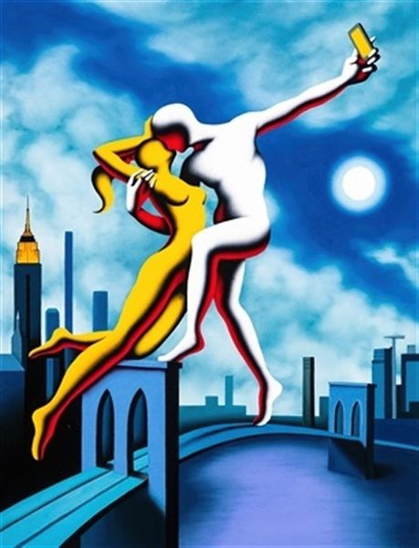 Curator: "Yesterday's Here," created in 2001 by Mark Kostabi. It’s a screenprint which really exemplifies Kostabi’s blend of modernism and surrealism. The style and the colours lend it a very distinctive pop art vibe. Editor: It hits me like a memory fragment. That clear, bright sky... It's joyful and ominous all at once. And those yellow figures – robotic dancers or maybe the last humans? Curator: Kostabi often uses these faceless figures, these "everyman" characters as some scholars describe them. In this work, they evoke a timeless quality, like figures in a dream or from some future archaeology. They lack individual characteristics, which adds to the symbolic quality, really inviting the viewer to fill them with their own narrative. Editor: Absolutely, and that's what pulls me in. The bright colours initially suggest optimism, but the shadow is inescapable, as if it foreshadows darkness. Do you think the airplane suggests escape, or is it a harbinger of some industrial threat, dwarfing that angular building in the background? Curator: The building could symbolize societal structures, but I am far more intrigued by its position so near those pyramids. It evokes Egyptomania and the symbol of the pyramids that has fascinated people across millennia. The airplane, against those surreal juxtapositions, brings to mind the fleeting nature of the present—what was yesterday is now just memory. Editor: That interplay, I suppose, is a part of the "yesterday" alluded to in the title. But "here?" I feel dislocated! Maybe Kostabi meant this “here” as some ambiguous zone we are about to enter. A stage before the end of days. Curator: The use of geometric forms across the work makes it quite distinct. It echoes early modernist painting—the simplified shapes really bring out a clean, slightly alien quality that emphasizes the placeless nature of the piece. And those clean, crisp colours give it such clarity. It feels unsettling yet approachable, doesn't it? Editor: Exactly. It's that unsettling accessibility that makes this print stay with me. It sparks the kind of discomfort that good art provokes – a reflection on what was, and perhaps more disturbingly, what is to come.