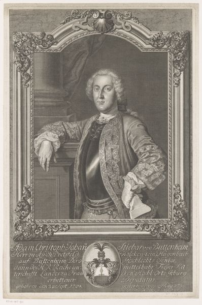 Curator: Good morning, everyone. Today, we’re looking at James McArdell’s "Portret van Crisp Gascoyne", a print made sometime between 1753 and 1755. What are your initial thoughts? Editor: An imposing figure. Look at that robe, the wig, and what seems like a small, very impractical sword. There’s a rather starchy quality to the image. It feels quite distant and grand. Curator: Absolutely. McArdell worked with mezzotint engraving, allowing for a remarkable range of tones, giving the portrait an almost painterly feel despite being a print. Think about the skill involved in creating those gradients to describe silk, satin and velvet on his attire, not to mention the cold, hard steel of the sword. Editor: You can almost feel the texture. I am particularly fascinated by that juxtaposition of hard and soft materials, a very clear distinction being made with how metal sits alongside flowing, embroidered fabrics. There's so much material culture on display—the trappings of power are tangible. What about the backdrop? Curator: A draped curtain, almost stage-like, and behind, an alcove containing a statue of Justice. Typical allegorical accessories for formal portraits of the era meant to hint at the subject’s virtues. Still, McArdell had a knack for imbuing the faces he depicted with such subtle emotions. Do you get a sense of Crisp Gascoyne's personality from the print? Editor: Hmm. Perhaps a hint of weariness in the eyes, but also determination. This image clearly speaks volumes about class and the construction of public persona, almost like branding, wouldn’t you say? Gascoyne’s office demanded the accoutrements. Curator: Precisely! The image wasn’t just a likeness, it was a carefully constructed declaration of status, influence, and authority reproduced and distributed by printmaking technology, a means of multiplying presence. Editor: Which puts a very different spin on this man, on how he must have wanted the citizens of London to perceive him...It invites us to really consider who profited from the circulation of images like this—how class, capital and artistry intersected in 18th century London. I wonder if Gascoyne had any say in the construction of this portrait or was he at the artist's whim. Curator: These prints offer us a fascinating view of a historical figure—and perhaps the historical forces that created him. What about the process and its legacy? Did prints change people's perceptions of status? Editor: Ultimately, perhaps what strikes me most is the human labor behind such artifacts—both Gascoyne, an influential magistrate who sought public recognition, and McArdell, a gifted artist working to refine new printing techniques. It serves as a sobering reminder about how social identities continue to be crafted through materials, representation, and artistic production.