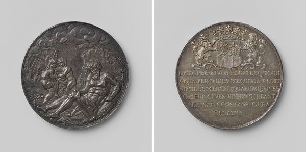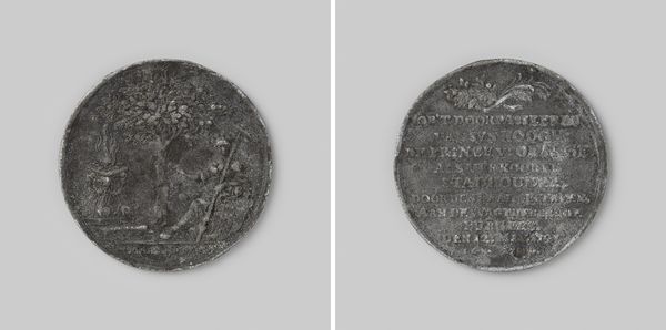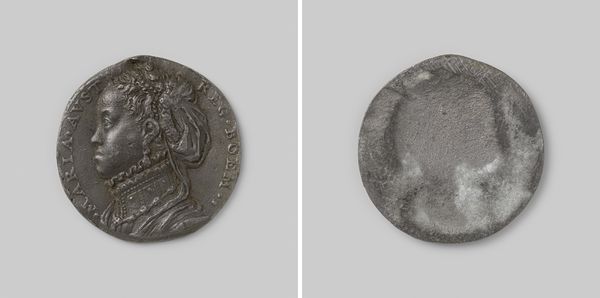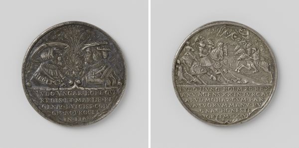 Curator: Looking at this, I immediately think of a lost world. The monochrome relief feels ancient. Is it some sort of coin or medal? Editor: Yes, precisely. What we’re observing is a bronze plaquette made by Hans Schwarz in 1519, titled "The Five Pfintzing Brothers." It functions as a portrait, but also as a historical document reflecting societal structures. Curator: The figures are striking, though their faces are quite worn. They seem very formal, austere even. There’s a severity in their expressions. It certainly gives off an air of privilege. Editor: Absolutely. It's vital to remember the socio-political landscape. Family legacy, especially male lineage, meant everything. Commemorating five brothers this way speaks to their importance, their power, and reinforces patriarchal structures. The wear you see could be interpreted, perhaps, as symbolic of time eroding that power, but its initial intention was surely the opposite. Curator: On the other side there appears to be a dense inscription. Can you read what it says? Editor: In Latin. It's dedicatory text listing names and likely some important roles or attributes associated with each brother. The inclusion of text further elevates the piece beyond a simple likeness, turning it into an enduring proclamation of the family's status and achievements. Think of the contemporary urge to be trending. Curator: How would something like this have been displayed? I imagine it was quite valuable at the time. Editor: Most likely it would have been privately held within the family. These kinds of artworks acted as status symbols but were also kept to uphold traditions, lineage, and remembrance. Its value resided not only in the material itself but in its symbolic power. Curator: Looking at it now, knowing more about its context, I find it both compelling and troubling. There's a clear intention to immortalize power, which, seen through today’s lens, prompts critical examination of those historical power dynamics. Editor: Exactly. The plaque invites a conversation about visibility, representation, and whose stories get told and remembered, even centuries later.