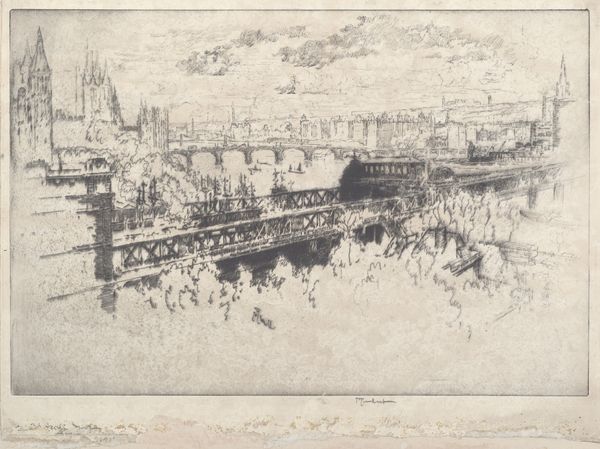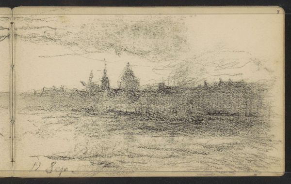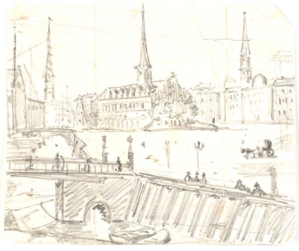 Curator: What strikes me first is its ephemeral nature. It is ghostly and feels unfinished, almost as though a memory is fading away. Editor: Well, this is "View from Gl. Strand over Højbro to Børsen" created around 1845 by Martinus Rørbye. He employed a simple medium - pencil on paper. Look closely; it’s far from unfinished. This isn't an accident of execution. Curator: I see a subtle critique of urban life emerging, though. The ghostly figures seem disconnected, almost alienated from their environment. Do you think it reflects a societal shift, a commentary on the emerging modern city? Editor: I agree. You can see the hand of the artist so plainly at work. The social context is also very interesting: Romanticism was interested in nation building through its aesthetic work. Curator: Romanticism, especially within a Danish context, certainly sought to define a national identity. And the deliberate portrayal of these national buildings contributes to that identity construction, situating Danish power in the landscape itself. What about the people in the drawing, how might their role be perceived within a narrative around labor and value? Editor: Interesting idea to see the labor! It looks, instead, like sketches after completion for a potential buyer. One can look at art to perceive value. But it certainly suggests something about who is depicted. The choice to sketch these subjects going about their ordinary business does speak to a desire to situate Denmark as both advanced and industrious in a world of increasing capitalism. Curator: Precisely! It also touches upon gender roles; we can't assume who is going to the labor market in those drawings. The artist perhaps opens a space for dialogue, maybe questioning the prevailing societal norms about identity. Editor: True! Curator: Thank you, exploring the interplay of material reality and social representation has revealed richer meanings than I initially imagined! Editor: Indeed, looking at how something is made and whom is in the view creates so many points of view. I am also leaving with much to consider!