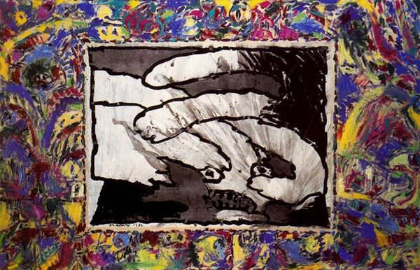 Here, Pierre Alechinsky captures the 'Taste of the Abyss' with a churning, blue vortex framed by frenetic lines. The central image evokes the Maelstrom, a motif that has haunted artists and writers, symbolizing both the sublime terror and the inexorable pull of the unknown. This abyss resonates with images of the sea serpent or dragon, symbols of primordial chaos. We see echoes of this in ancient myths, where the serpent represents the untamed forces of nature. But look closer – doesn't this swirling blue also recall the snake in the Garden of Eden? An emblem of forbidden knowledge, a plunge into uncharted territories of the self. Consider how the surrounding chaotic lines mirror the inner turmoil, the psychological whirlpool that the abyss represents. It reflects a cyclical progression: the abyss is not just an end but also a beginning, a return to the source from which new forms emerge, constantly evolving and resurfacing in our collective consciousness.