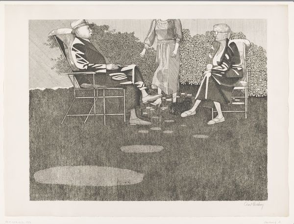 Editor: We're looking at Clara Gardner Mairs' "Negro Wedding" from around 1938, a print made with ink on paper. The dark figures against the textured background create an intriguing visual rhythm. What jumps out to you as you examine the piece? Curator: Immediately, the stark contrasts command attention, wouldn't you agree? The composition exhibits a deliberate orchestration of light and shadow. Consider the formal interplay between the solid black figures and the areas of fine, almost granular, texture created by the etching technique. Editor: It does seem quite deliberate. The textures definitely guide my eye around the composition. Can you elaborate on what the contrast adds to the meaning? Curator: The high contrast creates an overall mood that’s unsettling yet fascinating. The figures are presented in silhouette, obscuring their features. Without details, their expressions become ambiguous and generalized. The textures—the speckled floor, the lace of the dress, the curtain—add both visual interest and depth to an otherwise flattened picture plane. The figures almost become formal devices that balance and support each other, a marriage of abstract forms to convey a narrative. Editor: It’s fascinating to consider the piece primarily in terms of form and texture. How do you move past the immediate impact of the figures and the implied narrative? Curator: By focusing on the objective elements—line, shape, and tonal range. Note the repeated motifs: circles, rectangles, and triangles that are dispersed rhythmically. We must ask ourselves: what purpose does such a structured system serve within this representational image? Ultimately, Mairs created a powerful study in balancing tonal harmony with inherent formal contradictions. Editor: So by focusing on these visual components, we begin to see it as an act of structured contrasts, playing with darkness and light rather than a simple scene. Curator: Precisely. We’ve come to view the wedding not merely as a depicted event, but as an artful synthesis of carefully balanced formal devices and skillful artistry.