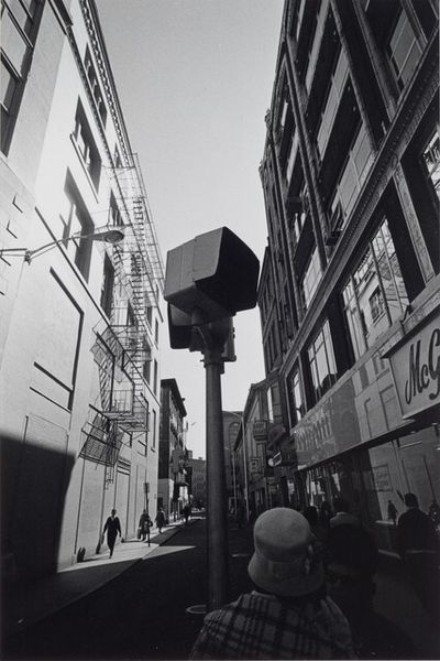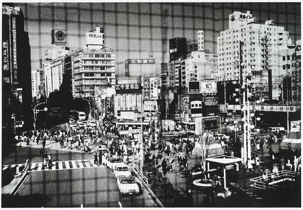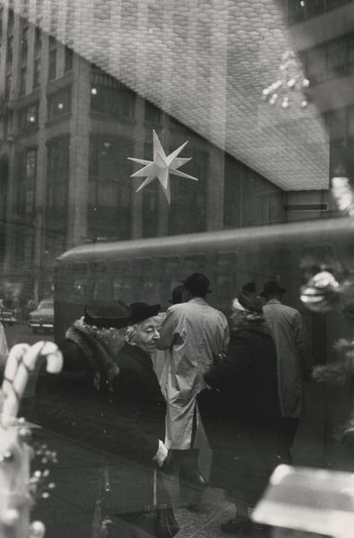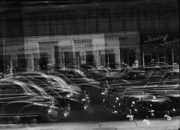 Curator: This gelatin-silver print by Harry Callahan, titled "Detroit," captures a street scene in 1943. Its tones are complex; there’s such a compelling juxtaposition of sharp detail and dreamy softness. What’s your initial reading? Editor: At first glance, the layers disorient me. The reflections and overlays create a world that’s both present and spectral, mirroring the transient nature of urban life, wouldn't you say? Curator: Precisely. The image demands a slower viewing. The formal tension between foreground and background flattens the space, creating a cubist-like compression. Note how Callahan plays with light and shadow, segmenting the composition into discrete pictorial fields, with shop windows serving as frames within frames. Editor: Yes, and thinking about the production itself: gelatin silver prints were the standard then. But Callahan's mastery of this process extracts a particular beauty. The materiality speaks to post-war anxieties perhaps, this sense of fleeting glimpses amidst the concrete reality of a bustling city and its consumer-driven industries? It reminds me that gelatin, after all, comes from animal collagen— connecting the urban scene back to a pre-industrial world of materiality. Curator: A rich connection, indeed! Considering the broader context of photography at the time, his image distinguishes itself through its dedication to form rather than purely documenting social realities. Callahan used the camera not only to record, but to investigate the very nature of seeing. His meticulous attention to contrast enhances the geometric organization, revealing his command over pictorial space. Editor: True. Although, if we pull back further, the photograph inevitably implicates consumer culture—with dresses and shop signs hinting towards economic forces. The labor embedded in manufacturing and maintaining those structures adds another layer—what appears as a reflection holds economic reality, the urban pulse driving postwar industry. The reflection isn't just a trick of light. Curator: A solid argument. Ultimately, "Detroit" achieves an impressive aesthetic resolution that’s evocative and formally brilliant. Editor: I concur. Looking deeper unearths a commentary on both artifice and everyday life during that era. Thanks for pointing those complexities out!