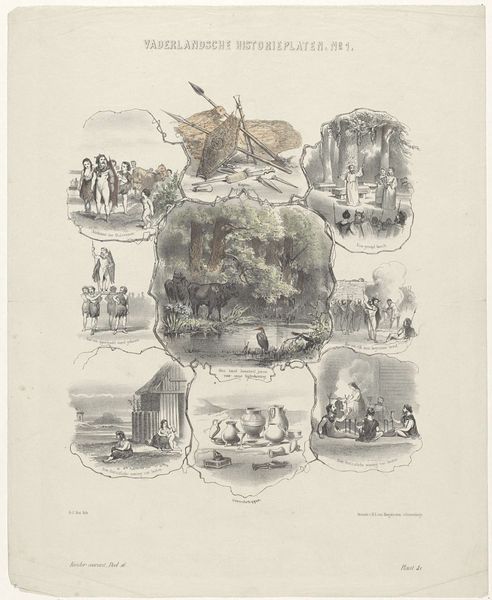 Curator: Let's settle into this "Boomen en Vogels," Trees and Birds, from roughly 1869 to 1882. What do you see here? What stories does this print whisper to you? Editor: It feels like a page torn from a fascinatingly old encyclopedia, William Henry Freeman's etching is incredibly detailed. The old engraving style makes it somewhat unsettling to my eyes, in its antiquated depiction. How do you interpret the overall composition of the plate? Curator: You're spot-on with that encyclopedia feeling! Think of it less as cold, scientific cataloguing, and more a visual poem about connection, about how our lives are interlaced with nature. It's a reverie on leaves, feathers, beaks… a naturalist's heartfelt notebook laid bare for us to peer into. Do you feel that the elements blend a singular mood? Editor: That’s an interesting way to think about it... but what strikes me are the isolated images – each is nicely rendered. Are we meant to see them as isolated specimens or part of something more significant, as in your reading of it as reverie? Curator: That’s the sweet paradox, isn't it? We can observe minutely – note the quill of a feather, the curve of a branch – yet sense an overwhelming interconnectedness at play. See the symmetry Freeman constructed across the work. Those birds find homes in these particular trees, they eat those berries. How fascinating would that be to render those connection visible to a nineteenth-century eye? Editor: I hadn't considered that interpretation before, it's changed my perception quite a bit, thank you! Curator: And thank you, for seeing things with fresh eyes. That, after all, is the most priceless art.