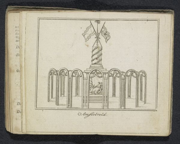 Curator: This intriguing ink and colored pencil drawing is titled "Decoratie op de Nieuwendijk, 1795." It depicts decorations on the Nieuwendijk, a street in Amsterdam, dating back to 1795. The piece is held at the Rijksmuseum. Editor: My first thought? It looks so restrained, almost clinical. The strong lines and geometric design give it a sense of order, but I wonder what occasion called for such formalized decorations. Curator: Exactly! That is where the history comes alive. 1795 was a pivotal year. This decoration likely reflects the Batavian Revolution and the arrival of French revolutionary ideals in the Netherlands. "Vryheid, Gelykheid, Broederschap" are inscribed across the top. Editor: "Freedom, Equality, Fraternity," but spelled with a "V" for Vryheid. I’m struck by how these concepts, radical at the time, are being presented through this classical, almost Roman-looking structure. It seems like they are trying to legitimize these revolutionary concepts by linking them to older, established imagery of power and authority. Curator: A keen observation. The Neoclassical style, popular at the time, sought to emulate the art and architecture of ancient Greece and Rome, cultures seen as embodiments of reason and democracy. Using it here connected the revolution to those ideals. Think of the civic virtue such symbology conveys. Editor: Absolutely, and the garland motif softens the otherwise rigid structure. It’s fascinating how visual cues were consciously used to sway public opinion and solidify this new social order, isn’t it? It's a reminder of how revolutions are also about redefining shared cultural languages. Curator: And about establishing public spaces that reflected a commitment to these values. In effect, every element here communicates a new ideological message, all in the service of creating a fresh cultural memory for this society. Editor: It makes you wonder how people reacted to seeing these declarations right in the middle of their everyday world. Thank you for pointing out what may otherwise have been invisible to me. Curator: My pleasure. Hopefully, that clarifies not only what the drawing represents but also how art becomes a key tool during periods of radical political transformation.