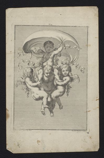 Editor: So, this is "Genius med blomster i hændene" – "Genius with flowers in his hands" – created in 1843 by Andreas Flinch. It’s an ink woodcut, which is interesting. I’m immediately struck by how this image seems to celebrate both artistic genius and the arrival of spring. How would you interpret this work? Curator: I see this as an intriguing example of how 19th-century art intertwined with broader societal values and nascent national identity. The cherubic figure bearing flowers obviously symbolizes creative genius and rebirth. Given the rise of national romanticism during this period, consider how Flinch's image could resonate with the Danish public. Editor: How so? Curator: Think about it: this was a time when defining "Danishness" was a key political and cultural project. Could this image, with its blend of classical imagery and blossoming flora, be interpreted as a visualization of Denmark's cultural flourishing? The artist may have sought to connect national identity to this symbolism. What’s your take on the role of the artist here? Was Flinch just reflecting popular taste, or was he actively shaping it? Editor: That’s a great question. Maybe it was both? The flowers feel inherently…pure, maybe, but they are arranged and drawn, not random. He could be subtly elevating the natural world, and suggesting art as the force that makes this happen. It sounds plausible, since these artworks might be targeted at private Danish households, embedding this national identity. Curator: Precisely! And notice the woodcut medium. Its relative affordability would allow wider circulation of this imagery, thus engaging more of the public. A very political project masked behind a cute image. Editor: This reminds me how many layers are involved in this type of analysis and the amount of details you need to check in art. Curator: Indeed. Art always participates in wider societal dynamics, which in turn informs its production, circulation and public reception.
