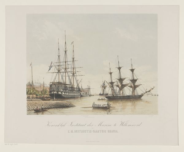 Johan Conrad Greive created this lithograph of the Fregat de Ruijter in the port of Antwerp in the 19th century. Greive was a Dutch artist known for his cityscapes and marine scenes, capturing the spirit of the Dutch maritime tradition. During this period, the Netherlands was consolidating its identity as a modern nation, proud of its naval history and commercial prowess. This cultural pride is palpable in Greive's detailed depiction of the ship, which seems to symbolize national strength. But, what about those who built and sailed these ships? What were their lives like? Who were they? The print invites us to consider the labor and lives of the sailors and workers, and what their roles were within this image of national pride. Greive’s composition makes us reflect on the relationship between national identity, labor, and the sea. The image becomes a window into the complex intersections of Dutch society.