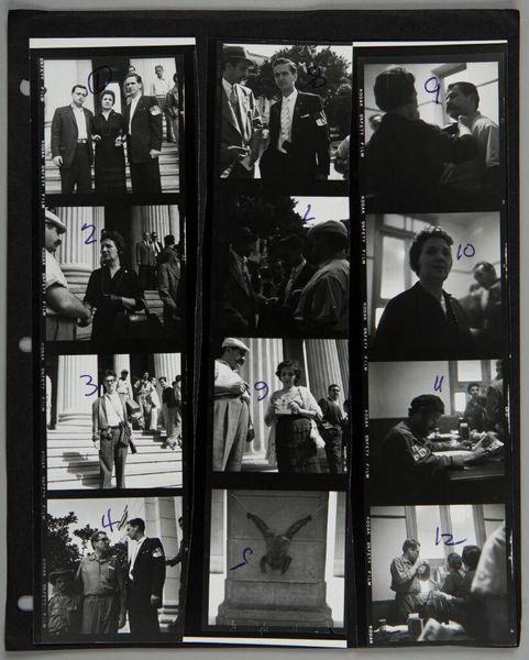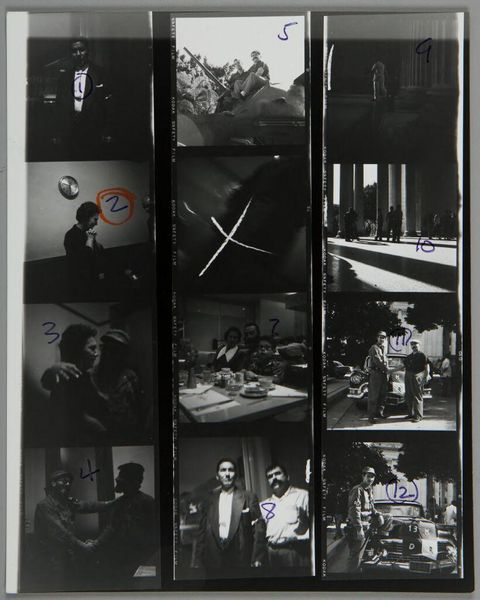 Curator: This is an untitled work by Lester Cole, a strip of eight photographs depicting Cuban politicians in what appears to be a library. The material is gelatin silver print, measuring about 10 by 4 inches. Editor: It's so cool! You get a sense of being behind-the-scenes, like peeking at some serious deal-making happening. Curator: Yes, the contact sheet format emphasizes the labor involved in photojournalism. The images, with their candid feel, capture a specific moment in Cuban political history, inviting speculation about the social dynamics at play. Editor: Makes you wonder who they are and what’s being discussed, doesn’t it? Almost feels like a film still from a spy movie. Curator: Indeed. Understanding the context of Cold War politics adds another layer to the narrative encoded within this photographic process. Editor: Exactly, it's like history frozen in time, letting us fill in the blanks. Curator: It leaves a lingering curiosity, doesn’t it? Editor: Totally, a whisper of stories untold.