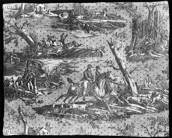 Editor: This is an intriguing textile work titled "Panel," created around 1814, and currently residing at the Minneapolis Institute of Art. It’s made from cotton, featuring a monochrome print of what looks like a historical narrative set within a landscape. What strikes me most is its visual similarity to toile – how would you interpret its use of imagery and choice of material in its historical context? Curator: The choice of textile as a medium is significant. Cotton toiles, particularly those with historical narratives, gained immense popularity in the late 18th and early 19th centuries, especially in France and subsequently elsewhere in Europe and the United States. Their wide appeal stemmed in part from advancements in textile printing, making these decorative fabrics affordable for a growing middle class eager to display erudition and worldly awareness. But more deeply, it offered accessible art for the home: history and landscape, merging fine and decorative arts, were no longer confined to the walls of aristocratic salons. Editor: So it was about accessibility, then? Did the depicted scenes also contribute to its appeal? Curator: Absolutely. Consider the subjects in this panel. While precise identification without knowing the source of its engravings is hard, one can suppose this narrates a story from exploration or ancient history. Such scenes served both educational and decorative purposes, reinforcing certain ideals of empire and the historical narrative. Notice the interplay between civilization and landscape? This reinforces a narrative of dominance, but one subtly present within a domestic, quotidian item. What implications do you think this may suggest? Editor: That is very interesting; it makes me realize how everyday objects can also perpetuate ideologies. I hadn’t thought of toile in that way before! Curator: Exactly, and hopefully, this panel helps highlight the politics woven within what we perceive as everyday life.