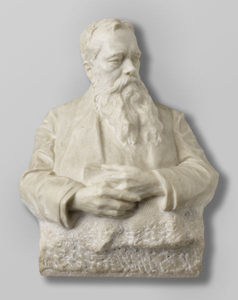 Editor: Here we have John F. Flanagan’s *Portrait of a Bearded Gentleman*, a marble relief sculpture from around 1890. The monochromatic quality gives it a really timeless feel. What stands out to you? Curator: Immediately, the formal relationship between the raised figure and the flat plane commands attention. Consider how the artist utilizes varying depths to define form. Note the incisive lines delineating the gentleman's profile juxtaposed with the soft modeling of the beard. It’s an exercise in controlled contrast. Editor: I see that, especially the way the light catches those deep carvings around his beard and jacket. Does the smoothness of the marble contribute to its impact? Curator: Undeniably. The inherent qualities of marble—its coolness, its capacity to reflect light, its density—imbue the work with a sense of permanence and authority. The artist manipulates the medium to achieve subtle gradations of tone, enriching the surface texture. This isn’t merely representational; it’s a formal study in material and light. Editor: So it's less about who the gentleman is, and more about the artist exploring form and texture through sculpture? Curator: Precisely. Our understanding rests not on anecdotal information regarding the sitter's identity, but on the formal dialogue between the artist, material, and sculpted form. The emphasis resides in how Flanagan manipulates line, plane, and light to generate aesthetic impact. Editor: That makes me see it in a new way. I was focused on trying to read some sort of narrative, but focusing on the qualities of the medium really unlocked the artwork's impact. Curator: Agreed. By engaging with its intrinsic artistic features, we can derive the fullest appreciation for Flanagan’s artistic endeavor.