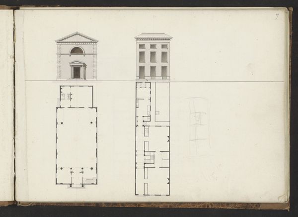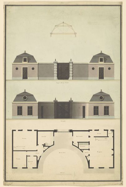 Editor: Here we have Jan Matthysz.’s "Elevation and plan of the kitchen at the Huis ten Bosch Palace", made in 1655, using ink and engraving on paper. It depicts both a frontal view of the building and a floor plan. I'm curious about what life was like in those times... What strikes you about this piece? Curator: It's a fascinating document of the Dutch Golden Age. Beyond just representing architecture, it points us to the systems of labor embedded in its creation and intended use. Think about the paper itself, the ink, the very act of engraving—all reliant on specific tools, materials, and skills of the artisans, wouldn't you agree? Editor: Definitely, I hadn’t thought about the making of it beyond its design. So you see the materials themselves as evidence of... what exactly? Curator: Consider the social context. This kitchen served a palace. Who worked there? What were their conditions? This plan isn't just about aesthetic design. It shows us how space, and thus labor, was organized. What ingredients would have been prepped in this kitchen, and who sourced them? Following this line of questioning reveals a hierarchy of production. Editor: That's a completely different perspective than I usually consider. I typically look at art through the lens of the artist's intention. Curator: But the "artist" here – a draughtsman, an engraver – were responding to specific demands, perhaps documenting pre-existing plans or visualizing the designs of someone else entirely. These aren’t romanticized "artists" expressing inner turmoil. They’re workers in a system. Editor: So by looking at the materials and the context of the drawing, we are uncovering evidence of class structure and modes of production. Thanks, I’ll keep that in mind from now on.
