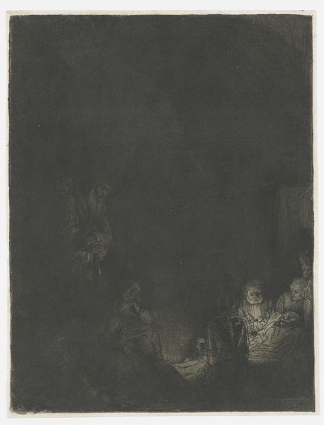 Curator: Here we have Rembrandt van Rijn’s "Christ Crucified between the Two Thieves," currently residing at the Harvard Art Museums. Editor: My first thought? It feels like peering into the abyss. Dark, tumultuous, yet strangely intimate. Curator: The composition is striking; Rembrandt utilizes dramatic chiaroscuro, forcing our gaze to grapple with the tension between light and shadow, order and chaos. Editor: Exactly! The scene teeters on the edge of overwhelming darkness, but that central figure… vulnerable, exposed. I almost feel like an unwelcome guest at a private, painful moment. Curator: Indeed, the materiality of the etching allows for an intricate layering of lines, a tangible manifestation of the scene's emotional weight and symbolic depth. What final impression do you have? Editor: Just how Rembrandt captured such raw emotion, so much pain. It lingers, doesn't it? Curator: It does. The formal elements coalesce to form a profound statement.