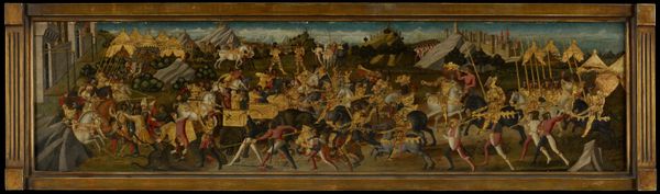 Editor: This painting, titled "Trappings" by Erik Thor Sandberg, depicts a rather unsettling scene in a forest. What strikes me is the strange mixture of childish play and primal hunting, all observed by the mounted animal heads on the trees. How do you interpret this work? Curator: Well, the forest itself is a powerful symbol, a place of the unconscious, where societal norms break down. The mounted animal heads speak to the traditions of the hunt, dominance over nature, but here they are silent observers, almost judging the chaotic scene below. What do the figures evoke in you? Editor: The figures, especially the children dressed in hunting gear, evoke a sense of inherited roles, perhaps the perpetuation of certain violent or competitive aspects of society, but with an innocence lost. Curator: Precisely. Look at the animal skins the figures are adorned in – are they trophies or disguises? They echo ancient rituals, a merging of human and animal. Sandberg is interested in that primal connection, that shedding of civilized layers. What does it mean that even childhood itself seems… tainted? Editor: It’s almost as if they’re acting out a drama passed down through generations, a script they haven’t fully understood but are compelled to perform. The trappings, both literal and figurative, seem to be weighing them down, even the ones riding those surreal horses. Curator: The horse is significant – nobility, power. But the multiple sets of legs are unsettling. Sandberg challenges these established power structures, almost mocking them through dreamlike distortion. Do you see a hopeful note in the piece, or is it purely a critique? Editor: It’s mostly critical to me. I’d say this artwork leaves us with questions about how the past continues to haunt the present. Curator: I agree. Sandberg successfully layers cultural memory, revealing the enduring impact of inherited values on human behavior, a sobering reflection, indeed.