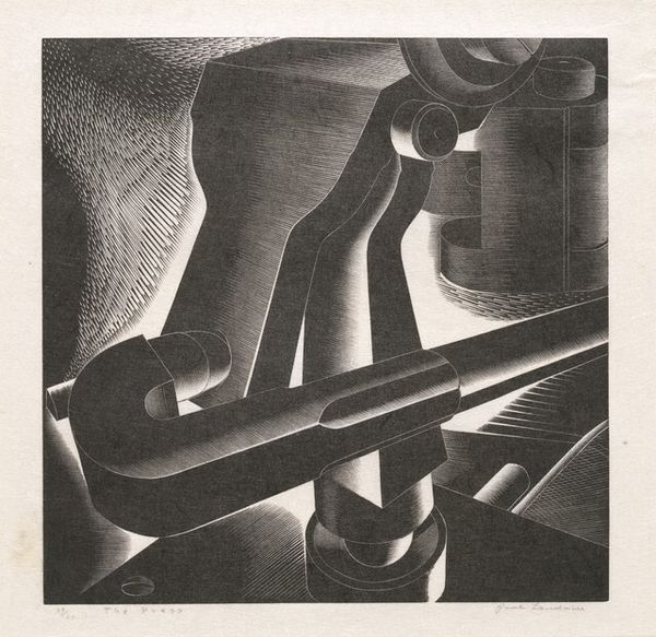 Paul Landacre made this wood engraving, called "Amateurs", with stark contrasts of black and white. It's all about the cutting and carving away, isn't it? Look closely, you can see how Landacre lets the wood grain do its thing. The lines aren't just lines; they're textures, moods, like stormy weather rolling in. The contrast creates a kind of raw energy. There’s the guy with the hammer and the figure standing in the background, seemingly at odds with each other. Are they building something, or tearing it down? Now, check out the way the light falls on the figure with the hammer. See how the strokes of the chisel make him look like he's caught in a moment of intense focus? It's like Landacre is saying something about the struggle and the messiness of getting your hands dirty. It reminds me of some of the prints of the German Expressionist Kathe Kollwitz. Both artists capture the everyday struggles of ordinary people, but Landacre’s image is more dreamlike, with an off-kilter perspective. Art isn't about answers. It's about stirring things up.