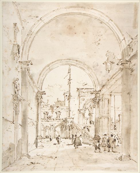 Editor: So, this is "View of the Gardens of a Palace" by Lodewijk Toeput, also known as Pozzoserrato, created sometime between 1565 and 1605. It's an ink and etching piece housed here at the Met. The detail is just incredible! What really strikes me is the almost theatrical sense of depth and perspective he creates. How do you interpret the symbolism at play here? Curator: This drawing presents a meticulously designed space, heavy with symbolic architecture and statuary, inviting reflection on power and the theatricality of governance during the late Renaissance. Look at the repeated use of columns and arches – they aren't merely decorative. Columns have historically represented strength, knowledge, and divine order. Note how these elements converge to create not just a garden but a stage for public life. Do you see how the arrangement affects your perception of the space? Editor: Definitely, the repetition almost feels like a deliberate attempt to control nature. And those statues, are they meant to be portraits or allegorical figures? Curator: Probably the latter. Statues often functioned as mnemonic devices in Renaissance art. These are probably personifications of virtues, maybe justice, prudence, or fortitude, subtly guiding viewers to reflect on idealized behavior. The entire garden becomes a kind of memory palace. Notice also that water feature... what do you suppose that means? Editor: I hadn’t even thought of the garden as a memory palace. The fountain feels celebratory, maybe a symbol of abundance or purity? This makes me reconsider the function of the space. Curator: Precisely. These curated landscapes provided an intellectual and visual framework through which ideals were promoted. It's fascinating how meticulously planned this representation of power really is. Editor: I’ll never look at another garden the same way! Thanks, that’s a great new perspective.