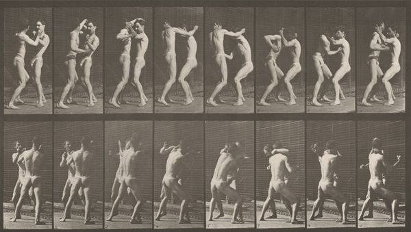 Eadweard Muybridge made this photographic study, "Plate Number 80. Ascending an incline with a 20-lb. basket on head" in the late 19th century. It’s one of many such plates intended to capture and analyze human and animal movement. Muybridge worked in an era gripped by scientific positivism. His motion studies reflect a desire to understand the world through empirical observation and documentation, mirroring a broader cultural interest in cataloging and classifying knowledge. This project was produced at the University of Pennsylvania, representing a collaboration between an academic institution and a photographer keen to break new ground in the field of visual studies. The choice of photographing a nude figure is telling. It speaks to the scientific ambition to study the human form without cultural or social distractions. It also raises ethical questions about objectification. Looking deeper into the institutional history of photography and science, we can examine the ways in which these images were used, circulated, and interpreted by different audiences. By exploring archives and publications from that era, we can gain insights into the complex social dynamics that shaped the production and reception of this artwork.