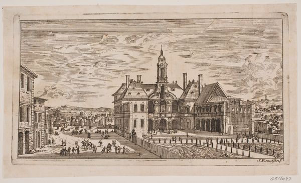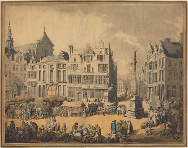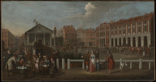 Art Historian: Editor: Here we have Isaac Ouwater's "The Nieuwe Kerk and the Town Hall on the Dam in Amsterdam," painted around 1780-1790. It's an oil painting, and it strikes me as such an ordered, balanced composition. Everything seems very precise and carefully placed. What do you see in this piece? Art Historian: Precision is certainly a key element. Notice how the artist employs linear perspective, guiding the viewer's eye towards a vanishing point and creating a strong sense of depth. How does the colour palette contribute to this effect? Editor: Well, the colours are quite muted. The building facades are mainly grey stone and reddish brick and this enhances that feeling of restrained elegance, doesn't it? I’d say that, in addition, that sense of space does make it feel almost staged. Art Historian: Indeed. Ouwater's manipulation of light and shadow is remarkable, imbuing the painting with a sense of atmosphere. Note, especially, how the natural light models each architectural element within its framework, including that somewhat dramatic skyscape. Tell me, where is the emphasis in that pictorial space? Editor: It definitely feels weighted towards the Town Hall. Its scale, plus it being further to the right makes my eyes focus that way! Art Historian: The positioning underscores its grandeur and authority in terms of visual language. By bringing structural considerations to the fore and by focusing more on how the elements interact with each other, and with space, the effect underscores social and economic meaning. Have your preconceptions been questioned? Editor: I can definitely appreciate the way the artist plays with architectural structures. I learned that analysing structure can offer another approach to enjoying this piece.
