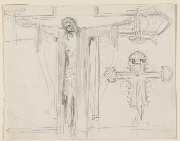 Curator: The air in this gallery feels suddenly weighty, doesn’t it? Is it just me, or does this pencil drawing of "The Kalvarienberg" by Johann Vincenz Cissarz cast a spell? I think it’s the Städel Museum’s acquisition department that brought it to us. Editor: It's profoundly moving; the gray shades breathe somber feelings, and they weigh heavily in the space around. What kind of theoretical framing could possibly hold something that raw? Curator: Perhaps this rawness resides in Cissarz's process, allowing the artist's inner reflections to pour unfiltered onto paper. His rapid, almost frenzied strokes suggest he wrestled directly with profound concepts, like mortality. I sense a history-painting bent. Do you sense a theological aspect in the figure of Jesus? Editor: Unquestionably theological, but I'm arrested by the formalism at play here. Notice the composition's architecture; vertical lines creating order even amidst apparent chaos, while the interplay of light and shadow sculpts emotional intensity, creating almost a stage, and setting for something. Is this staging of an existential drama intended? Curator: I suspect so, or maybe it just comes naturally when you're dealing with such hefty themes. It looks like Cissarz knew exactly what he was doing when conjuring up those light beams from darkness—that's hope. Editor: Let us also consider how that linear mark-making isn't only descriptive. Instead, it establishes its own visual language which invites a discourse, so that an intimate humanism meets raw aesthetic emotion in a conversation beyond the boundaries of this gallery space. Curator: Oh, this piece definitely prompts reflection—you can’t just glance at it. "The Kalvarienberg" has the magic to make the viewers delve into both the technique used, and what it means to deal with it. Editor: Well said. So, with that consideration of depth and resonance, may we now conclude this examination?