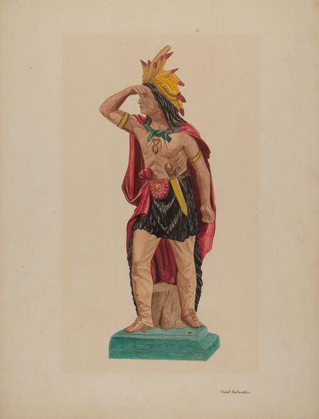 Curator: This is John Sullivan’s "Cigar Store Indian," likely crafted around 1937. It is a drawing incorporating painting and carving, which provides a powerful, immediate presence. Editor: Indeed. There's a striking, almost melancholic, quality to this depiction. The composition itself, the figure’s gesture—hand raised to the brow—creates an air of watchfulness and waiting. Curator: It's fascinating to consider the semiotics at play here. The upraised hand directs the viewer's gaze, but more importantly, it points toward a presumed vanishing point that exists far beyond the static display. There is an implied invitation into an abstracted distance. Editor: While also signifying "Indianness" as a fabricated commodity of commerce in tobacco shops. Consider how the use of wood and carving emphasizes a particular kind of labor—the roughhewn nature versus smooth manufacture speaks volumes. Its materiality serves an economic function, drawing potential customers to the product with implications of cultural significance but stripped of meaningful representation. Curator: And yet, the careful application of paint—note the ochre tonalities of the skin, the verdant greens and yellows in the headdress—lends a complexity, resisting a purely reductionist view. Editor: I’m more interested in the process; it speaks of an artisan engaging with available resources within the constraints of commercial demand. This labor and object exist firmly within the realms of both making and consumption, high and low. Curator: Perhaps, but in its formal execution, it evokes something deeply symbolic. The stoic pose and simplified, almost iconic presentation tap into universal archetypes of Indigenous nobility or maybe dispossession and the romantic ideal. It's undeniably complex, structurally and conceptually. Editor: Exactly—complex because its very creation necessitates exploitation of cultural heritage for market needs. Sullivan’s sculpture reveals complex labor politics, highlighting how art is created and consumed in ways tied to social and economic exploitation, not timeless abstraction. Curator: Your reading pushes us to reflect upon the economic mechanisms inherent in such representations. Editor: And yours emphasizes the artwork’s power to signify, offering us very different routes of interpretation of art-making within economic structures.