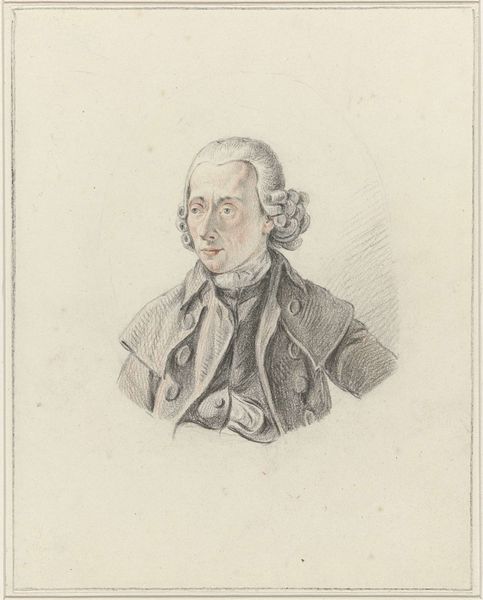Editor: So, this is "Portret van Jan Willem Caspari," a drawing by Gerrit Lamberts from between 1800 and 1822. It's a pretty straightforward pencil portrait, almost severe in its simplicity. What do you make of it? Curator: Oh, it's more than just severe, it's delightfully mischievous! There's a definite twinkle in his eye, wouldn't you say? Like he knows a secret we don’t. It captures a real personality, doesn’t it? Beyond the Neoclassical style that wants everything neat and tidy, there's this wonderful, slightly irreverent spirit peeking through. The almost caricatured features suggest a lightheartedness, even as the medium—pencil drawing—hints at restraint. What do you think Lamberts was trying to convey here? Editor: I guess I was too focused on the serious tone. Now I see the playfulness. It's like he's trying to hold back a laugh. Perhaps a more candid portrayal, a slice of real life creeping into a formal setting? Curator: Exactly! Think of it like a little rebellion against the stiff portraiture of the time. Maybe Lamberts knew Caspari well, caught him off guard between official poses. The subtle modelling almost softens the strong angularity of the lines too. Does the lightness of touch add another layer? Editor: It does! That light touch, alongside what feels like a very unguarded expression, really humanizes Caspari. He feels more real, more accessible, doesn't he? It’s quite brilliant. Curator: See? He’s a secret sharer of joy, captured just so. And now, perhaps, we are too. Editor: Definitely! I will always check for the playful nuances from now on!