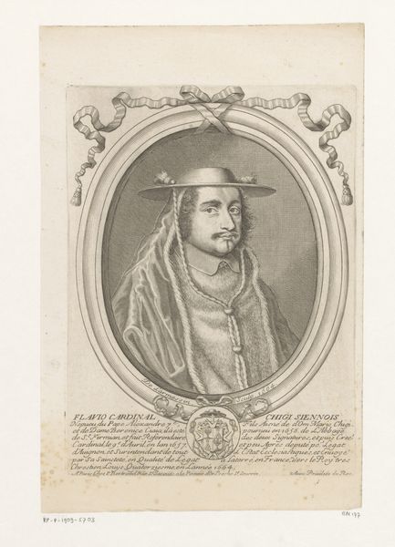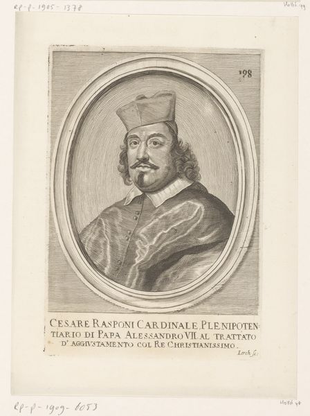 This is Johann Alexander Böner’s print of Paluzzo Paluzzi Altieri. The circular form of the portrait is immediately striking, composed of a series of concentric lines that frame the cardinal's likeness, drawing our eye to his face. Böner's technique employs hatching and fine lines to sculpt the forms, creating a delicate interplay of light and shadow. The texture of the cardinal’s robes is carefully rendered, conveying a sense of depth and materiality. The choice of monochrome emphasizes the graphic nature of the print, focusing our attention on the linear elements and their arrangement. The portrait is more than a mere depiction, it's an assertion of power and status within the visual language of the Church. The carefully inscribed text at the bottom functions as a semiotic key, identifying the sitter and his high ecclesiastical rank. Böner’s manipulation of line and form not only captures a likeness but also communicates the subject's identity.