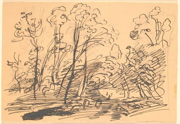 Editor: So here we have an untitled drawing by George Bunker, probably from around 1969. It seems to be pencil and ink on paper. There's something so immediate about the sketch-like quality… almost raw. It makes me feel like I’m glimpsing a fleeting moment in a forest. What do you see when you look at it? Curator: A good question to ask to unlock the creative freedom! What I immediately connect with is its dance between representation and abstraction. It's a landscape, clearly referencing organic forms, perhaps a stand of trees… but it’s fractured, dreamlike, existing more as a memory of a place. Doesn’t it feel a little like catching a glimpse of something from the corner of your eye? As if Bunker is showing us what he *felt* while looking, more than what he precisely saw? Do you see the landscape convention and hints? Editor: Absolutely! It's a very visceral landscape. You can feel the quickness of his hand and there’s a really great dynamic quality that the lines give to the composition. So the sketch wasn’t just about rendering the real then? Curator: Exactly. I see the pencil and ink almost like musical notes here – Bunker is composing an emotional response to the land, orchestrating how a place *feels*, all those messy bits! The incomplete aspect makes you work to fill in the blanks. Isn't there an excitement in figuring it out as we go, between intent and freedom? What has stood out to you through this experience? Editor: It made me realize how much the artist's mark, even a quick sketch, can convey feeling and not just a scene. Curator: Exactly, like you said: immediate, visceral…art becomes a place for sharing these personal landscapes.