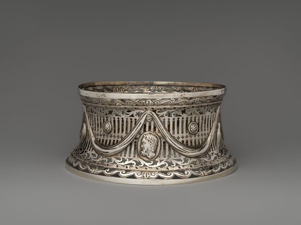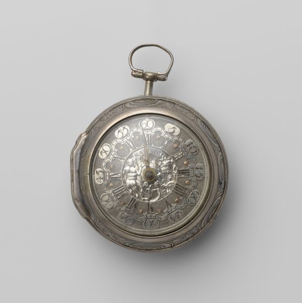 This silver brooch, by Firma W. Visser, is inscribed with 'Vrije volken sterven niet', meaning ‘Free people do not die’. The piece is finely wrought in a filigree style, the details delicate and precise, as if the metal itself was a flexible, yielding material. The intricate network of lines creates a dynamic interplay of light and shadow. Look closely and you can see the radial composition, with flags unfurled around the edge. The metalwork feels almost like drawing. The brooch, with its inscription, embodies resistance and resilience. The way the light catches and reflects off the silver surface adds to this, the object itself shining with defiance and hope. It reminds me of the work of Lázló Moholy-Nagy, who experimented with light and transparency, exploring the interplay between form and space. This brooch isn’t just a decorative object; it’s a powerful statement, a wearable piece of art that speaks to the enduring spirit of freedom.