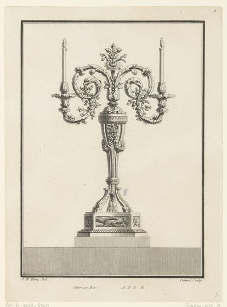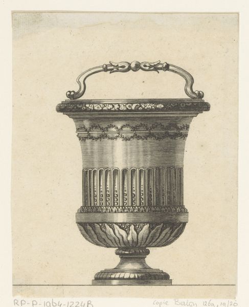 Curator: Oh, hello! I’m instantly drawn to the engraving before us: "Vaas met vlammen op voetstuk," which translates to "Vase with Flames on a Pedestal," crafted between 1778 and 1779 by Gottlieb Friedrich Riedel. Editor: There’s such rigid grace to this; I imagine stumbling upon it in some old study. All the sharp lines give a sense of something poised and eternal...almost like a funerary monument but in a smaller, manageable scale. Is there something commemorative at play here? Curator: Yes, definitely! The piece exemplifies the Neoclassical movement, which was all about rediscovering and repurposing the aesthetic values of antiquity. We have it on paper, of course, an engraving, but can imagine it perhaps as part of a larger scheme for interiors, exteriors – possibly a garden or civic space. Think carefully arranged homage. Editor: I suppose the symmetry gets to me. Each garland, each line has a definite, unchanging purpose. Though, I can’t help but focus on the faces, that classical device set among each corner of the base. So perfectly generic in that era, do they represent anyone? Curator: We cannot be sure if these represent specific individuals, or maybe this wasn't Riedel's intent at all, as such designs served more as decorative models or as inspiration for other works. In terms of its time, we are dealing with a rise in classicism, particularly via archeology – literally unearthing the old empires as templates of power. A kind of artistic or even intellectual control is on display, isn’t it? Editor: I can feel that very well through Riedel’s arrangement of this form; the man held the keys to what the public found tastefully ideal and emotionally fulfilling. Thinking of that power to impact collective sentiments—well, that's no light matter. Even those flickering flames feel tamed into decorum at the summit. Curator: The Age of Enlightenment, isn’t it? Order and reason… This piece is part of the museum’s broader collection, where you will find it alongside similar drawings and prints from that period. Editor: Yes, it strikes me that it is as if he captured lightning in a bottle, but the bottle, rather than containing magic, organizes what we want the world to represent. Anyway, it’s quite a reminder to approach with skepticism everything one generation idealizes over another! Curator: An intellectual balancing act for the ages…and we get to see how beautifully it takes shape through art. Thank you!