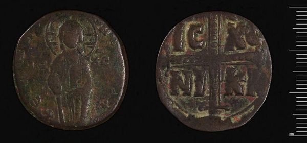Editor: This is the Trachy of Manuel Komnenus-Doukas of Thessalonike, a small, metallic coin held in the Harvard Art Museums. What stories do these figures tell, Curator? Curator: The coin's imagery reveals a complex interplay of power and divinity. Notice how Manuel is depicted alongside a saint, a common trope asserting divine endorsement. What feelings are evoked by seeing these two figures together? Editor: It feels like a claim to legitimacy. Were coins like these widely circulated? Curator: Absolutely. These were tools of propaganda. The repetition of these images would have reinforced Manuel's authority within the collective consciousness. They acted as small, portable icons. Editor: That makes me think about how we use images today. It's fascinating to see that impulse reflected so far back. Curator: Indeed. The coin serves as a reminder of the enduring power of symbols to shape beliefs and perceptions.