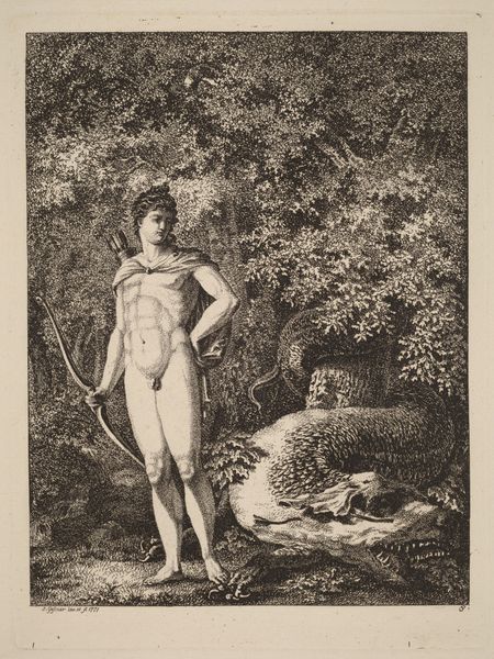 Curator: Charles Clément Bervic, who lived from 1756 to 1822, created this image called, "Innocence." Editor: The figure's pose, combined with the stark contrast between light and shadow, makes this image feel incredibly staged. Curator: Bervic was well known for his engravings, and this one, housed here at Harvard, certainly reflects his technical skill, particularly the delicate lines defining the figure and the surrounding flora. It speaks to the visual culture of its time. Editor: Yes, the textures are quite remarkable. But the tension between the subject and snake, the dove clutched in the figure's arms—it all suggests a precarious balance of innocence and experience. Curator: It seems Bervic created a stage for morality; the image and its title were very likely meant to educate the public on virtues, which was a common theme explored by artists during this era. Editor: Precisely, and that dynamic interplay is what continues to resonate with viewers today. Curator: It certainly prompts deeper contemplation on the subject of virtue and societal expectations.