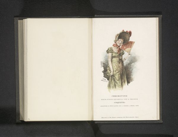 Curator: This untitled watercolor by Mary Georgiana Caroline Cecil Filmer is mounted in an album page, overlaid on an earlier photograph. The year "1862" is inscribed beneath. My first impression is how small it is, a vignette of daily life. Editor: The woman with the green umbrella immediately strikes me as an emblem of bourgeois domesticity, a figure of contained respectability. The umbrella itself seems almost like a shield. Curator: The album format suggests a personal, almost intimate context. Albums were, after all, spaces to collect memories and to curate a personal narrative through images and keepsakes. Editor: True, and what materials! Watercolor delicately layered over a photograph, metallic paint decoration, inscription. What's the labor embedded in this arrangement? It seems a careful construction of social identity. Curator: I see the green umbrella as more than protection; it’s a vibrant, verdant pop of color, a symbol of hope and renewal against the backdrop of a likely dreary English day. Editor: I see the materials as performative; they tell a story of careful arrangement and reveal the artist's investment in the image. Curator: Indeed, together the image and the album format speak to how personal history and social identity are intertwined. Editor: A small watercolor indeed, yet it holds an entire social world.