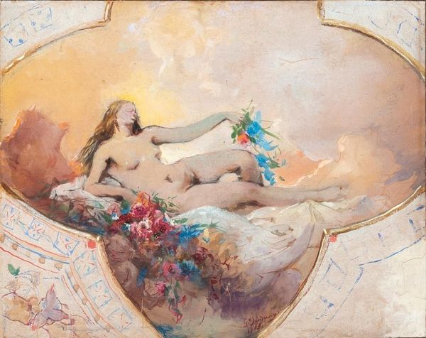 Curator: This oil painting by Luc-Olivier Merson, titled "An ethereal beauty with putti in the clouds," was completed in 1885, and it's simply awash in Romantic sensibility. What catches your eye? Editor: Immediately, the languid figure dominating the center—she projects a kind of dreamy vulnerability. The cherubs around her evoke a childlike innocence, like she's protected in some kind of divine dreamscape. Curator: Merson was a celebrated academic painter. It is tempting to see this work as an interesting study in allegory in line with his well-known work “Rest on the Flight into Egypt”. There is perhaps an interplay of innocence, beauty, vulnerability... I can not help but wonder to which figure or social commentary this is meant to represent or provoke. Editor: Absolutely. Consider the symbolism of the cherubs. In Western art, they're usually tied to notions of love, innocence, sometimes even death or mourning. And this woman isn't just reposing; she’s shrouded by what appears to be a dramatic dark cloth or cloak. Is she awakening to the earthly plane, shedding that which covers her? Curator: Precisely! Merson painted this in a period where Academic art was being challenged. We have the impression of him negotiating the demands of representing the female form within these institutional structures and also the stirrings of the Symbolist movement towards dream-like subjectivities. The artwork becomes an interesting conversation between traditions and the shift toward modernism. Editor: Yes, there's an almost photographic realism to the nude figure’s skin tones and details, countered by the fluid, indistinct rendering of the clouds. It creates a sense of otherworldliness, separating her, visually, from reality as we know it. Merson uses visual language that blends very well with the spiritual yearning of the period, while reflecting older symbolist languages. Curator: When contextualizing “An ethereal beauty with putti in the clouds,” you recognize its role as more than just decoration; rather, the oil painting contributes to an ongoing dialogue concerning the place for beauty, tradition, and progress, as well as changing perceptions of women in society. Editor: I am leaving this with a lingering thought on how Merson has embedded archetypal symbology, creating an image that whispers of hope, or, at least, an idyllic refuge within a storm.