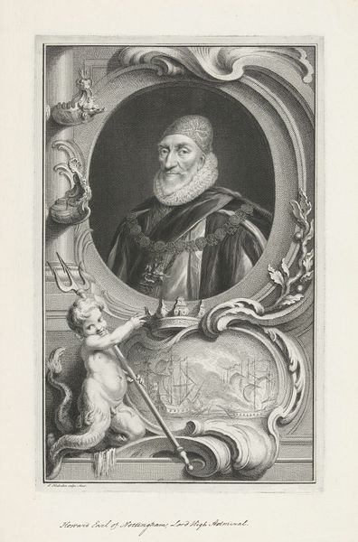Curator: Welcome to this exquisite 1608 engraving titled "Portret van Georg Burckhard." Crafted by Jakob Lederlein, it presents a striking image of a man of evident stature, made with meticulous detail. Editor: My first impression is one of contained power. Despite its age, there's something incredibly commanding about this piece, wouldn't you agree? The figure feels very present and important. Curator: Absolutely. Lederlein’s work, printed on paper, captures Burckhard in a classic Baroque style. I find myself drawn to the techniques evident in its production. Look closely at the deliberate mark-making – the texture suggests both the status of the sitter, but also the economic reality of the commissioned piece. Editor: The iconography is what grabs me! Note the frame itself: a fusion of cherubic figures and grotesque masks. This contrast between innocence and experience, the celestial and the terrestrial, tells us much about the sitter's perceived role. Even the book in his hand isn't merely a prop; it's a symbol of his learned profession, literally holding the weight of knowledge. Curator: It's interesting that you interpret it in that way. I was thinking about the availability of the print itself. How did these images function? Consider the paper, the ink – it's a powerful statement about who had access to these images and what messages they promoted. These were tangible expressions of social stratification. Editor: And that tangible quality reinforces its symbolic significance! This portrait is a conscious effort to immortalize not just a face, but a set of values and ideals. His position, as written above his head, is integral to how he wishes to be perceived. Every detail, from the ruff to the framing, plays its part in constructing his legacy. Curator: Right, so the image operates as an example of a cultural and commercial moment: paper-making techniques enabled the expansion of imagery. Engraving allowed for more reproducible formats of artworks for those who could access them, and ultimately played a pivotal role in solidifying and circulating Burckhard’s status. Editor: Looking at the overall artwork, its symbolic density is compelling. Lederlein gives us more than just a portrait, they provides an artifact of social and cultural values of 17th-century Europe. Curator: A well-stated point! And that makes the materiality all the more telling, once we consider production processes, networks, and consumption in those times. Editor: Indeed. It has certainly given me something to think about on my next walk through the collection. Thank you.