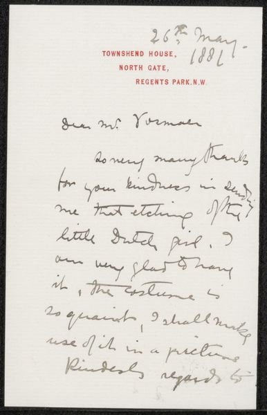Editor: Here we have "Brief aan Carel Vosmaer," possibly from 1883, a drawing in ink on paper by Laura Theresa Alma-Tadema. It's a handwritten letter, and seeing her script feels quite intimate. What do you see in this piece, beyond the surface of a thank you note? Curator: It’s interesting to consider this letter as more than just a personal correspondence; it’s a tangible artifact of Victorian artistic and intellectual circles. Alma-Tadema’s reference to translating “The Amazone” hints at a vibrant network of literary exchange. How might her gender influence her position and participation within such networks? Editor: That's a perspective I hadn't considered. Did women face specific hurdles or have different roles in these artistic communities? Curator: Absolutely. Despite their often-significant contributions, women artists and intellectuals were frequently marginalized. Alma-Tadema’s letter, while seemingly simple, provides a glimpse into how she navigated these social structures. Was she merely thanking Vosmaer, or subtly asserting her presence within his sphere of influence? And what power dynamics may be implicit, both as a woman and relative to Vosmaer himself? Editor: So, you're suggesting that this isn't just a thank you note, but perhaps a quiet declaration of her involvement and intellect within a male-dominated world? Curator: Precisely. Examining her choice of language, the careful script, and even the formality of the address, "Dear Mr. Vosmaer," reveals a calculated performance. It’s in these seemingly mundane details that we find the seeds of resistance and negotiation. Editor: That completely changes how I view this letter. It's no longer just a document; it's a statement! I learned so much from your point of view. Curator: And I find myself appreciating anew how personal letters offer insights into history’s grand narratives.