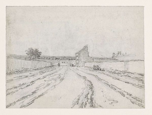 Curator: This drawing offers us a glimpse into the 17th-century Dutch countryside. The Rijksmuseum holds this work, “View of the Village of Almkerk, with Huis Altena on the Left,” created around 1646-1647 by Roelant Roghman. It's rendered in graphite, a rather humble medium for such a tranquil scene. Editor: Tranquil is one word for it. I immediately notice the linear perspective, directing the eye down a road, bisecting fields. The pencil sketch creates an almost austere feeling. The subtle shading gives depth but somehow, there's a striking simplicity about it all. Curator: Roghman was deeply influenced by the artistic landscape and the socio-economic realities of the Dutch Golden Age. We see the importance of topographical studies, almost like records, particularly for properties and landscapes. The drawing itself becomes a document of its time. It depicts the estate Huis Altena. Consider that many Dutch artists at the time received commissions to accurately represent architecture in landscape. Editor: True, the structure on the left is quite detailed and looks rather grim for this serene view, and if you follow the sightline to the horizon, note the repetition of similar dark forms, a pattern echoed elsewhere, like the shrubbery that lines the road. Curator: Precisely, these landscapes were embedded within complex systems of land ownership and social hierarchies. The sketch shows how visual representation could serve power. It is an idealized record and promotes cultural values by showcasing estates with farmland and their aesthetic integration into a pastoral countryside. This also reflects the growing wealth of the merchant class. Editor: Looking closely, the handling of light intrigues me, or lack of strong chiaroscuro effects. This reinforces the scene’s dreamlike atmosphere, focusing the attention to how forms interact with negative space to organize an open, flat land. I wonder if we aren't interpreting an aesthetic judgement onto a mundane document. Curator: Art, as you know, does not exist in a vacuum, right? So many drawings like these end up in collections and institutions that frame our reception of art and history, especially one that reflects not only what, but also whom the land belongs to. Editor: It really emphasizes the flat land—its emptiness—perhaps we can interpret that nothingness through negative forms and structural division and, perhaps too, what it means about place, wealth and value during that historical time.