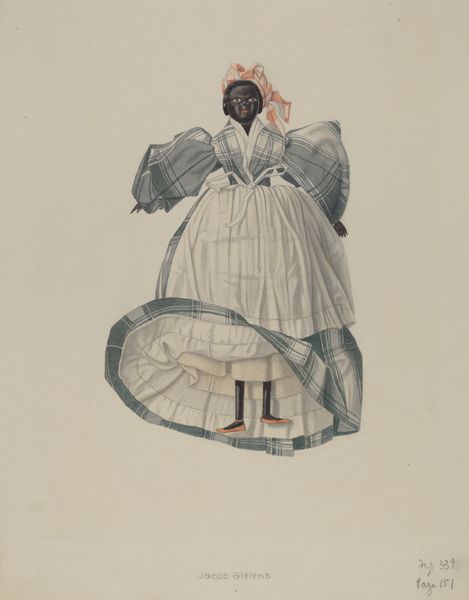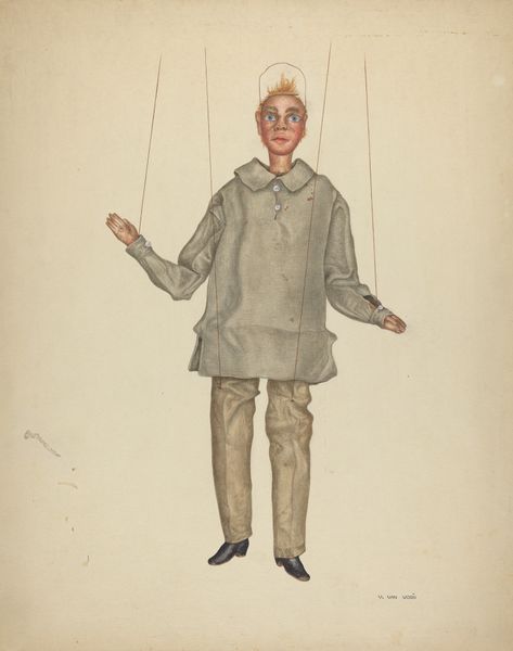 Editor: This is Vera Van Voris' "Puppet - 'Cotton Picker,'" created around 1936 using watercolor and drawing techniques. I'm immediately struck by the puppet's attire and the overt symbolism of forced labor implied in the title, and by how it all makes me a bit uncomfortable. What do you see in this work? Curator: The work's power lies in its direct engagement with labor and representation. Looking at the materials - the watercolor, the paper, the strings suspending the puppet – what narratives about production and consumption do they evoke for you? The artist uses inexpensive material to highlight how exploited bodies and exploited materials reinforce one another. Editor: I see what you mean about inexpensive materials reinforcing the message, but what is the artist really trying to get at? Curator: Consider the context. The 1930s was a period of widespread economic hardship, coupled with deeply ingrained racial inequalities. This object highlights those tensions by using the caricature of the black "Cotton Picker" as a symbol, laid bare for its purpose by being a "puppet". Can we ignore the racialized dynamics embedded in its making and the making of a caricature? Editor: It’s a lot to consider. It almost feels like the artist is showing the exploitation of labor and of materials, while simultaneously contributing to problematic imagery. Curator: Precisely. The materiality makes visible the connection between labor, objectification, and consumption, laying bare the complexities and contradictions of the historical moment. We’re forced to reckon with these issues head on because of the way Van Voris depicts and materializes them. Editor: It definitely gives you a lot to think about, from the context of the artwork's production, to its presentation of the subject. Thanks! Curator: My pleasure!