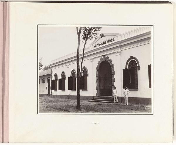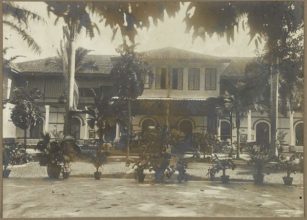 Editor: So, this is "Medanhotel," a photograph taken sometime between 1914 and 1919. It really captures a moment of colonial-era grandeur with those imposing palm trees. What I find most striking is how the rigid architecture contrasts with the tropical foliage. What do you see in this piece? Curator: What strikes me immediately is not just the visual, but the context. The Medanhotel, I presume in Medan, Sumatra, Indonesia, during this period represents a very specific power dynamic. The meticulously maintained architecture screams of colonial control and order, deliberately contrasted against the “untamed” tropics suggested by the palm trees. It is a curated image, isn't it? A statement of authority. Editor: You mentioned 'curated'. In what way exactly is this 'curated' to suggest authority? Curator: The photographer’s choice of perspective is crucial. The hotel is presented frontally, symmetrical, as if declaring its importance. The staff posed neatly on the porch, reinforcing a social hierarchy. And the contrast between the structured building and the exotic plants… Do you think it highlights the civilizing mission of colonialism? Editor: That's fascinating, how a seemingly straightforward photograph is actually making such a complex statement! It definitely sheds a new light on the way I see colonial-era images. Thanks! Curator: And, in turn, examining the reception of these images helps us understand the enduring power dynamics they represented, and sometimes, continue to perpetuate.