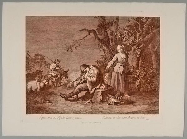 Editor: This is "Peasant Woman with a Basket of Fruit" by Pellegrino dal Colle. It looks like an etching. The woman's pose is very striking, she seems to be dancing through the frame. What do you see in this work? Curator: Indeed. The composition, with the woman centrally placed, her figure forming a dynamic diagonal line, is quite compelling. Note the artist's use of line to create texture, particularly in the rendering of the animals' coats and the woman's garments. Editor: It's like a snapshot! Curator: Precisely. Also, observe the contrast between the detailed foreground and the more loosely defined background, a technique that enhances the sense of depth. The artist is not simply depicting a scene but constructing a visually engaging experience. Editor: So, it is not necessarily about what is depicted, but more about how it is depicted? Curator: Precisely. Thank you. Editor: I see it now.