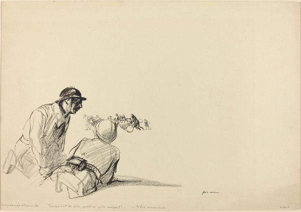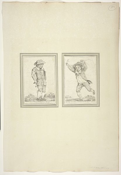 Curator: Two illustrations for “Fabler for børn,” created by Erling Eckersberg between 1808 and 1889. They're etchings, simple line drawings depicting boys engaged in play, very unassuming at first glance. Editor: Unassuming is right. They're faint, almost ghost-like. And what’s with the scale? There is such vastness surrounding them! There's a strange sort of desolation conveyed in what should feel carefree and childish. I am intrigued, yet melancholic. Curator: Consider the materials—etching on paper, mass-produced, accessible. These weren't intended for a palace wall, but for children, likely within printed books. The purpose, fundamentally, is education, even morality. Editor: Aha! And how do these images, these two separate scenes of children playing, play into the political and social structures of the era? Are these “good boys,” fitting within accepted social mores of conduct and behavior? Curator: It's less about the individual actions, I suspect, and more about cultivating a literate, moral populace. Eckersberg was deeply embedded within the Danish Golden Age art scene, with connections to intellectual circles that emphasized education as a form of social upliftment. These fables served as miniature didactic plays for children. Editor: So, less about revolutionary fervor and more about cultivating quiet acceptance of the dominant narrative? The prints themselves are inexpensive, widely distributed, thus contributing to a collective understanding of propriety through narrative and imagery? It’s almost manipulative, in a quiet way. Curator: That's a very contemporary reading! However, look closer and appreciate the delicate lines. This kind of labor demonstrates the effort put into creating and distributing moral tales to teach children how to be civilized subjects through production itself, the prints themselves standing as material proof of that investment. Editor: That changes the way I consider this set of illustrations. Thank you, that deeper insight reframes it as more complex artifact, beyond a simple, quiet moment of childhood. Curator: Yes, seeing them with those considerations helps unveil a deeper layer about social context of these times and this region.