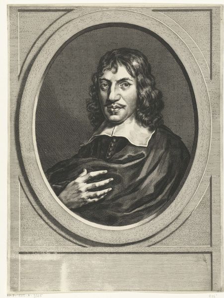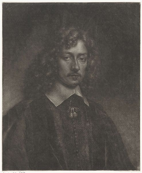 Wallerant Vaillant created this portrait of a man at an unknown date, using the mezzotint technique. Notice how the image, enclosed within an oval frame, draws your eye to the face, rendered with remarkable tonal variation against a subtly gradated background. Vaillant’s mastery of mezzotint is evident in the textures he coaxes from the metal plate. This technique—dependent on contrasts between light and shadow—creates a certain psychological depth. The man’s gaze, directed slightly off-center, creates a compelling tension, while his hand gestures softly toward his chest, hinting at introspection. The composition functions as a sign. In semiotic terms, his clothing and pose signify status, while the tonal qualities evoke mood. Consider how Vaillant uses form to not just depict, but to construct meaning through carefully calibrated visual cues, inviting continuous and diverse interpretations.