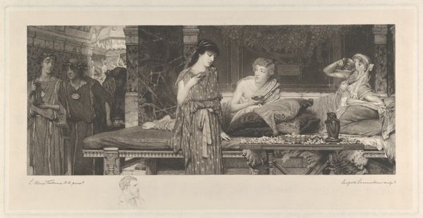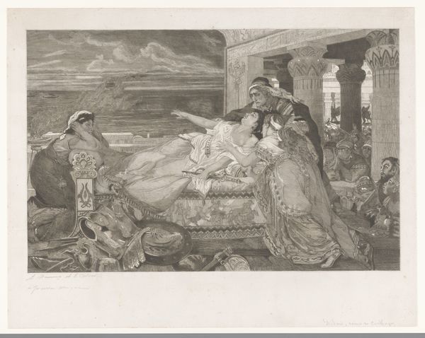 Curator: Welcome. We’re looking at "The Captive" by H. Harrison, originally published in the Illustrated London News in 1848. It's currently held at the Metropolitan Museum of Art. What strikes you first about this print? Editor: A palpable sense of confinement and melancholic repose. The monochromatic rendering, typical of prints, amplifies this quiet sorrow. Curator: Observe the contrast between the delicate lines defining the woman's features and the bolder, more assertive strokes delineating the figure tending to her. How does that strike you formally? Editor: This deliberate divergence invites questions regarding agency, race, and power relations, especially when viewed within the history of Orientalism and colonialism. Curator: Precisely. The artist employs hatching and cross-hatching to sculpt form, creating volume and depth that draw the eye into the interior space. Note, too, the arrangement of objects around the woman - a mirror, trinkets... do they serve to console, distract, or simply reflect her gilded cage? Editor: I’d argue that these objects are staged. This is a performance of luxury designed to distract from, and perhaps justify, the sitter's captivity. This image normalizes the dehumanization of some so that others can maintain status. Curator: While I see the potential for that interpretation, let’s consider the formal elegance of the composition first. The use of light and shadow…the interplay of textures—all these elements coalesce into a unified aesthetic experience, irrespective of its historical context. Editor: Can we really detach this image from the imperial gaze of 1848, when it was published, normalizing specific power dynamics and further cementing an ideology? That formal elegance becomes deeply troubling when one considers whose beauty is being elevated, and at what cost. Curator: Well, this piece demonstrates how artistic choices contribute to visual storytelling, inviting contemplation beyond historical interpretations. Editor: For me, the potency of "The Captive" arises from its entanglement with colonial history, urging us to reflect on power imbalances, representation, and resistance within visual culture.