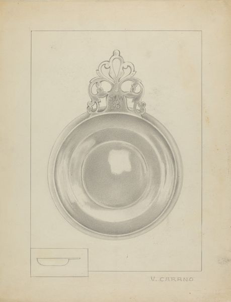 Neva Coffey made this drawing of a match safe, but we don't know exactly when. It's all in pencil. I'm drawn to the way the drawing emphasizes line and shape to bring forth the ornate character of the object. Look at the face on the front, see how the artist has used cross hatching to create a sense of depth and shadow. And there is a real tension between the flat surface of the paper, and the illusion of 3-D form. It reminds me of a kind of optical game, where you have to do some work yourself, your eyes have to do some work themselves, to find that sense of depth within this image. What's really interesting to me is how the process of drawing itself becomes a way of understanding the object, its texture and detail, while also allowing the artist to bring their own perspective and interpretation to the work. It reminds me a little of the work of Vija Celmins, where there's this real obsessive focus on detail, but also this real sensitivity to the surface of the paper. It's a kind of conversation between the object and the artist, where neither one is fully in control.