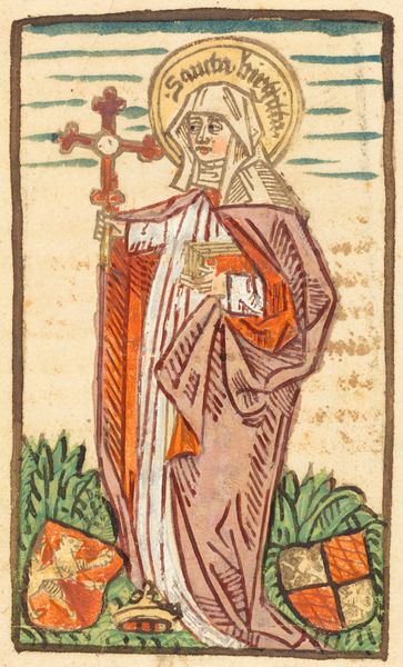 Editor: So this woodcut print is called "St. Catherine (copy)" and was created sometime between 1511 and 1600, attributed to Hans Baldung. The use of color gives it a certain vibrant energy despite its age. How do we unpack its historical relevance? Curator: Well, let's consider the political landscape. The proliferation of prints like these, particularly during the Reformation, offered a way to disseminate religious imagery beyond the Church’s control. Do you notice any symbols here that speak to that period’s conflicts or beliefs? Editor: I see Catherine holding the sword and the wheel, but beyond that, it's mostly just the city in the background and the standard halo. Would you say this image functioned as propaganda or simply personal devotion? Curator: It’s a complex question. Saint Catherine was a popular figure, a symbol of wisdom and resistance against tyranny. Making multiples of such figures enabled their wide distribution but who funded these productions and who was the target audience? That's part of what interests me, because it helps us understand what issues really gripped popular imagination. Notice also how Catherine is represented; a powerful yet vulnerable figure in a dynamic landscape. Editor: That's fascinating – considering it less as a static religious icon and more as a cultural artifact shaped by production and reception. I never thought of it that way. Curator: Exactly. Studying the image in that way lets us view the political history of imagery itself. Editor: This really changes my perspective on how I view religious art. Thanks for making it clearer!