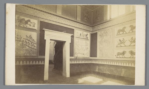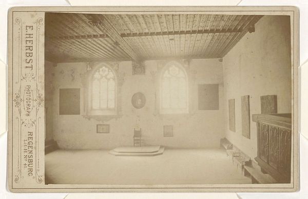This photograph of Zaal in het stadhuis van Regensburg was taken by Emil Herbst in the late 19th century, using a camera and photographic printing techniques. The image, captured on a rectangular card, depicts a well-lit hall within the Regensburg City Hall, complete with benches, windows, and decorative elements. Photographs like this one were made in multiples, and sold to tourists as mementos. The image captures a quiet moment, emptied of the labor of civic administration or debate that would normally fill this space. We see only the artifacts of these activities – the benches, the windows – all bathed in soft, even light. The photograph would have been one of many views of picturesque German sites, produced at a scale and cost that made them widely accessible. Consider this image not only as a representation, but as an object that participated in shaping the popular understanding of Regensburg. The photographic techniques used to make this artwork, are as valuable as the artwork itself, highlighting the fusion of industry and culture.
