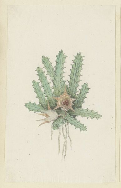 Editor: This is a drawing of the Huernia namaquensis, or Namaqua carrion-flower, by Robert Jacob Gordon, made sometime between 1777 and 1786, using pencil and watercolor. It has such a delicate quality. What stands out to you about this botanical illustration? Curator: The labor involved in creating this image strikes me. Think about the conditions: the artist venturing into Namaqualand, the meticulous observation, and the precise hand required to render such detail using available materials. Editor: Right. I hadn't considered the actual *making* of the piece so deeply. Curator: Exactly. Watercolor and pencil on paper were commodities, expressions of colonial power, and influenced by material availability. Consider also, why render the carrion-flower so realistically? Was it simply scientific documentation, or was there also an aesthetic purpose driving the selection and portrayal? How does that tension shift our interpretation of it today? Editor: So, not just a pretty picture, but a record of a place, and a resource, made with specific materials during a particular moment in time. I never thought about Romanticism through that lens before, seeing it less about beauty and more about… material conditions. Curator: Precisely! The romantic lens shapes the art, while the means to acquire material shapes its creation, dictating the experience for both the artist and audience. Editor: Thinking about it that way makes me realize how intertwined art, labor, and colonialism really are. It definitely provides a different point of view! Curator: Absolutely! Examining materiality provides powerful ways to read beyond surface appearances.
