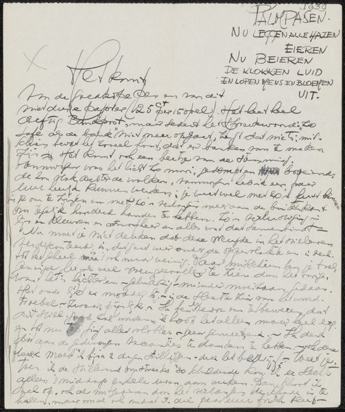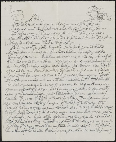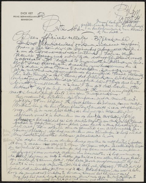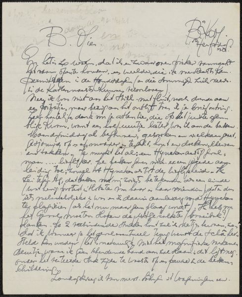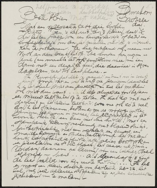 Curator: Here we have “Brief aan Mien Cambier van Nooten” by Dick Ket, likely created between 1940 and 1943. It's ink on paper and currently resides in the Rijksmuseum. Editor: It looks like a handwritten letter; the script is very dense. I can’t read Dutch fluently, but it looks like an intimate communication. What stands out to you about this work? Curator: Well, the letter being written during the Nazi occupation is critical. Consider the act of writing, of intimate correspondence, as a form of resistance. The choice of calligraphy, which, while seemingly traditional, becomes radical through its sheer existence and subversion of imposed silences. How does this reframing alter your understanding? Editor: I see what you mean. The personal becomes political. Was the act of creating this letter itself a defiant act, irrespective of its content? Curator: Precisely! The very act of using "high art" calligraphy, typically reserved for official documents or formal correspondence, for a personal letter, becomes a subtle rebellion. It’s a reclamation of agency, an insistence on humanity in dehumanizing times. Doesn’t this change your perspective? Editor: Yes, it casts a totally new light on what I initially saw as simply a personal note. It speaks to the power of everyday resistance and finding subversive expression when other avenues are blocked. Curator: And it reminds us that even in the darkest periods, the human spirit finds ways to communicate, connect, and subtly defy oppression. That tension between personal expression and sociopolitical context is key to interpreting this piece. Editor: This has been incredibly insightful. I’ll definitely look at artworks with a more critical and historical perspective from now on. Curator: That's all that I can ask! Approaching art through an activist lens enriches our understanding and fosters critical dialogues that remain vital today.