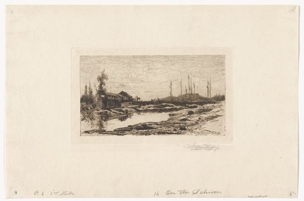 Editor: This is Stephen Parrish's etching, "Flooded Lands," dating back to the 19th century. It evokes a real sense of stillness. It makes me wonder: how do you interpret this landscape? Curator: The desaturated tones definitely cast a somber mood. The skeletal trees rising from the water's surface strike me as powerful symbols of endurance but also vulnerability. We're seeing the encroachment of water, representing a transformative, perhaps destructive, force of nature, don't you think? How does that resonate with you, considering it was made in the 19th Century? Editor: I suppose the potential encroachment on the land by nature does add a certain tension. Were there specific anxieties around industrial development, perhaps, influencing this imagery? Curator: Precisely. Etchings like this provided an easily accessible visual record of a changing landscape. It documents both a nostalgia for an untouched past, and apprehension towards the rapidly changing environments because of the increasing mechanization. Can you detect any symbols here? Editor: Besides the trees, I suppose the cabin in the background could stand for human impact? Curator: It could. The cabin offers both a symbol of habitation, a sense of intrusion upon the wilderness, as well as an aspiration for harmony between humans and nature. What does this pairing evoke for you? Editor: Thinking about those themes gives the landscape a deeper complexity. It moves beyond being just a nice view and presents an intriguing tension between humanity and the environment. Curator: Absolutely. Art often challenges our perception, leading to a greater consciousness of our place in the world.