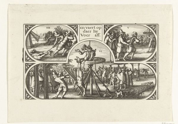 Editor: We’re looking at “Jason tempting the two bulls of Mars,” a print made in 1563 by René Boyvin. It's an engraving, giving it incredibly fine lines and detail. The composition is packed with figures! What jumps out to you? Curator: The symbols are clamoring for attention, aren’t they? The oxen themselves are powerful, literally representing brute force and martial prowess—connected as they are to Mars. Jason's act of "tempting" suggests manipulation of that power. Does that feel different from direct confrontation? Editor: Definitely. It's cunning, not just strength. Also, what's with the skeleton on the ground? Curator: Ah, a *memento mori*, wouldn't you agree? A reminder of mortality, a frequent player in allegorical prints like this one. It emphasizes the stakes involved in Jason’s quest. Power and glory… but at what cost? The artist positions it literally beneath Jason’s feet, and therefore under his power. Are the implications becoming clearer? Editor: I think so! He’s using his wits to overcome death… or at least, ignore it for now, in pursuit of victory. That really brings out the complexity of the hero archetype. And how does the ornamental border play into it all? Curator: Notice the grotesque masks, the putti. Borders frame narratives but also reflect them. These are symbols of life, death, fertility, fear. They're a reminder that stories of heroism always take place within the larger cycle of human experience. So many layers! Editor: This makes me see the engraving as much more than just a historical depiction. It's a meditation on power and mortality, wrapped in this incredibly intricate visual language. Thanks, I would have just seen the surface without your help! Curator: Precisely! And that intricate visual language, remembered over centuries, helps us access deep veins of cultural meaning still resonant today. It continues to remind us to consider more deeply all that our visual world offers.