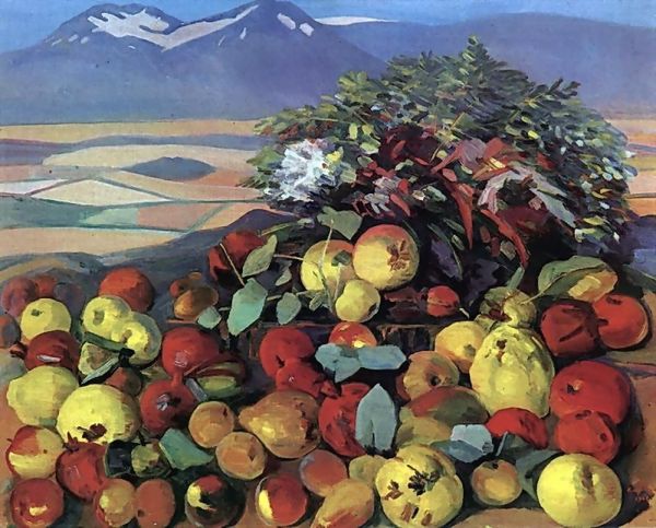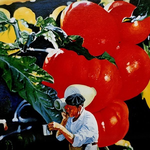 Curator: Welcome. Today, we're looking at "Beet Gatherer," a painting from 2016 by Babak-Matveev. It’s a striking piece that brings together portraiture, landscape, and elements of folk art, seemingly all at once. Editor: Wow, it’s…intense! Like a vibrant fever dream. My immediate feeling is one of overwhelming abundance—maybe even a bit claustrophobic with all those colors. But the woman’s gaze is really grounding. Curator: I find it interesting to situate this work within discussions of labor, particularly focusing on the labor of women in agriculture. Consider how it might be speaking to traditional gender roles within rural communities. Editor: Yeah, and the beets are almost monstrous! Like, 'Little Shop of Horrors' monstrous, which contrasts sharply with the prettiness of the floral patterns in her shawl and the backdrop. Is this meant to be a statement about the hidden toil behind idyllic imagery? Curator: Exactly! And let’s not ignore the visual cues suggesting “naive art”, combined with a hyper-real quality. This potentially complicates simple readings about rural innocence or hardship. What if this work is playing with romanticized notions of peasant life while also subverting them? Editor: The clash is palpable! I almost feel like the painting is mocking the idea of the pastoral, while simultaneously being seduced by its beauty. Curator: Precisely. Also, how does the artist, in your opinion, leverage our expectation when considering “landscape art”? Editor: It makes me think about manipulated environments, even the kind we consider idyllic like that manicured garden backdrop with the pergola. I read somewhere the artist often juxtaposes manufactured and natural environments. The whole scene feels staged. Even her calm is staged somehow. Curator: The work operates as a site of negotiation, between visual languages of past and present but it prompts viewers to actively question representation, identity, and social narrative. Editor: It is a lot to chew on for sure! It has prompted me to question my preconceived ideas of romanticizing labor when in reality the truth may lie closer to that monstrous beet than the red rose. Curator: Indeed. There’s a challenge to complacency here and a invitation to continue interrogating the picture. Editor: Absolutely, and after considering the layers, the intense fever dream that struck me is looking more and more like a complex meditation.